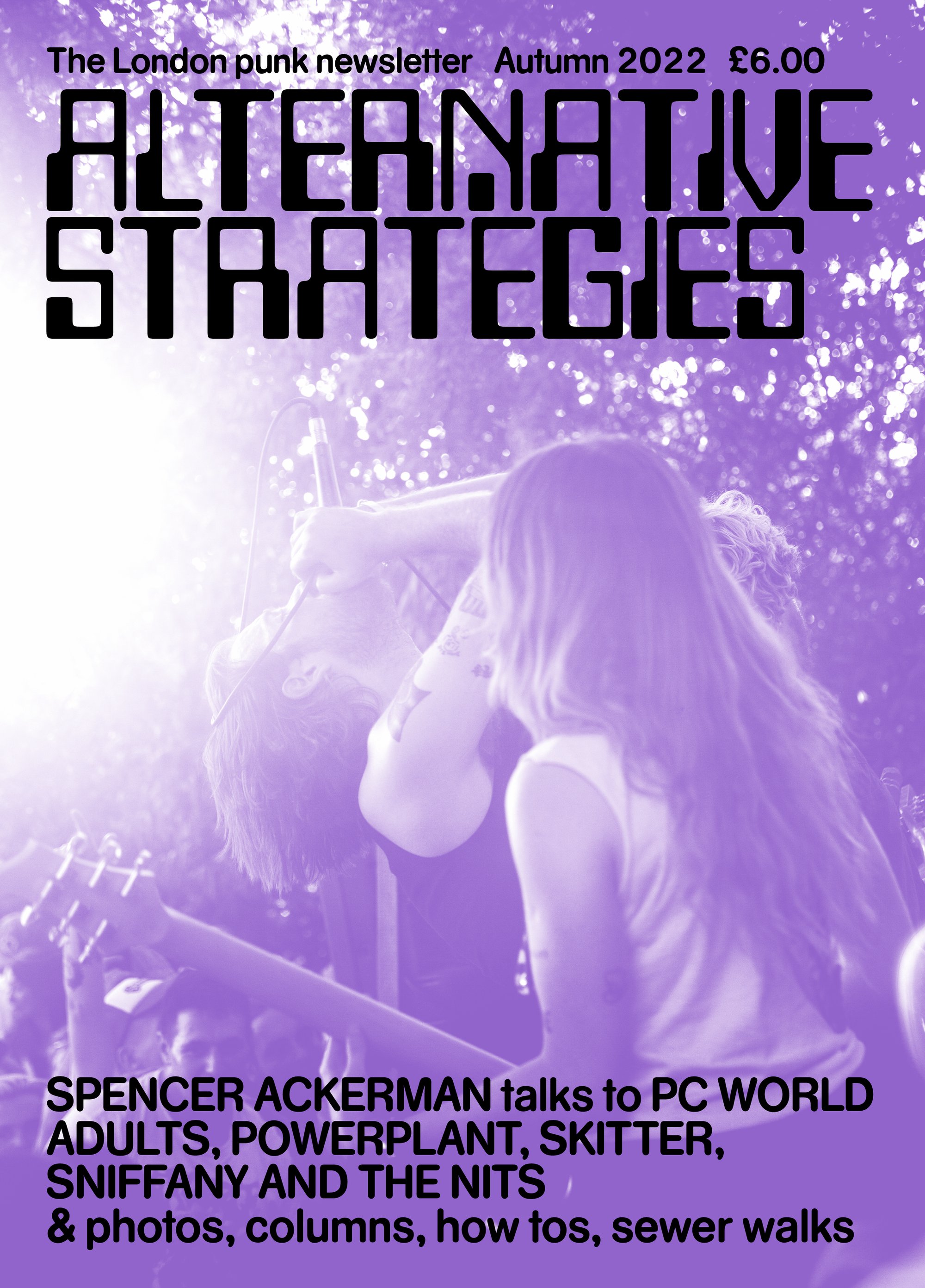 London, 36-page A4 Riso fanzine. Catch-ups with ADULTS, SNIFFANY AND THE NITS and SKITTER. PC WORLD interviews SPENCER ACKERMAN of Forever Wars and writer of the upcoming DC Comics series Waller vs. Wildstorm. POWERPLANT sneak us an exclusive peek at their adventures. Gigs reviewed from memory, guides to streaming gigs and records, and tons more.