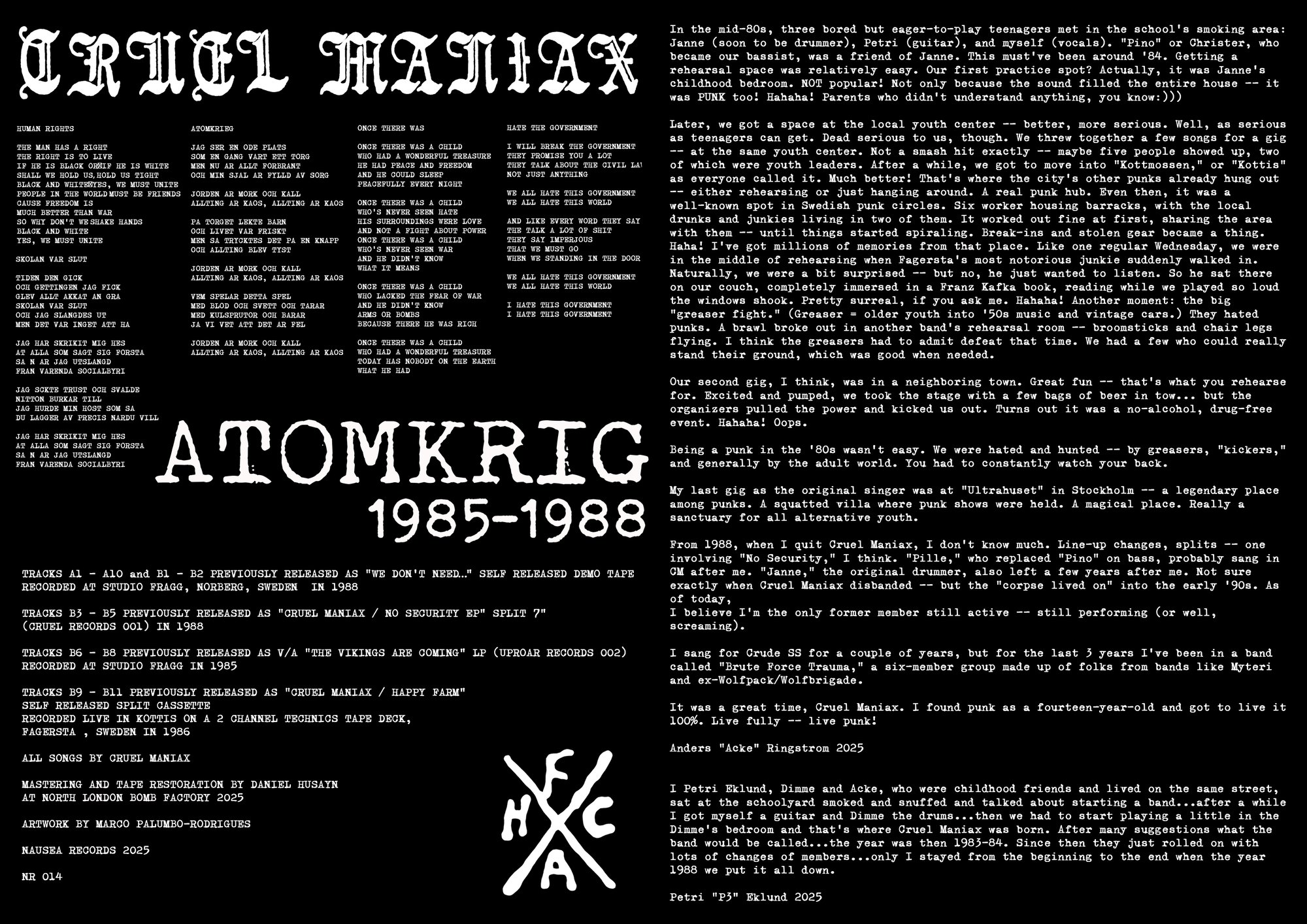 Cruel Maniax were formed in 1983 in Fagersta, Sweden. Part of the Fagersta Hardcore Crew together with Fear of War, Bedrovlers