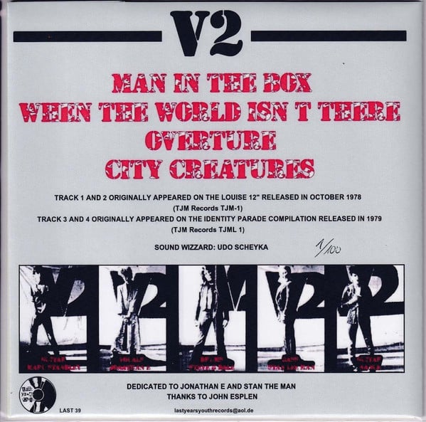 Manchester '77 punks, two from the "Identity Parade" comp LP, two from first 12" including "Man In The Box". Grey vinyl, numbered, 100-only